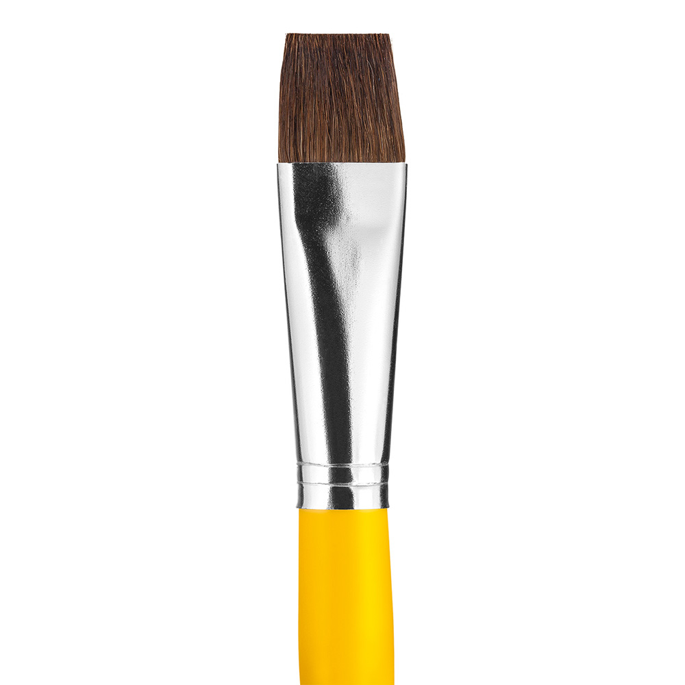 Pincel escolar achatado - pelo natural de orelha de boi, cabo plástico cor amarela. Pincel indicado para pintura escolar em geral.