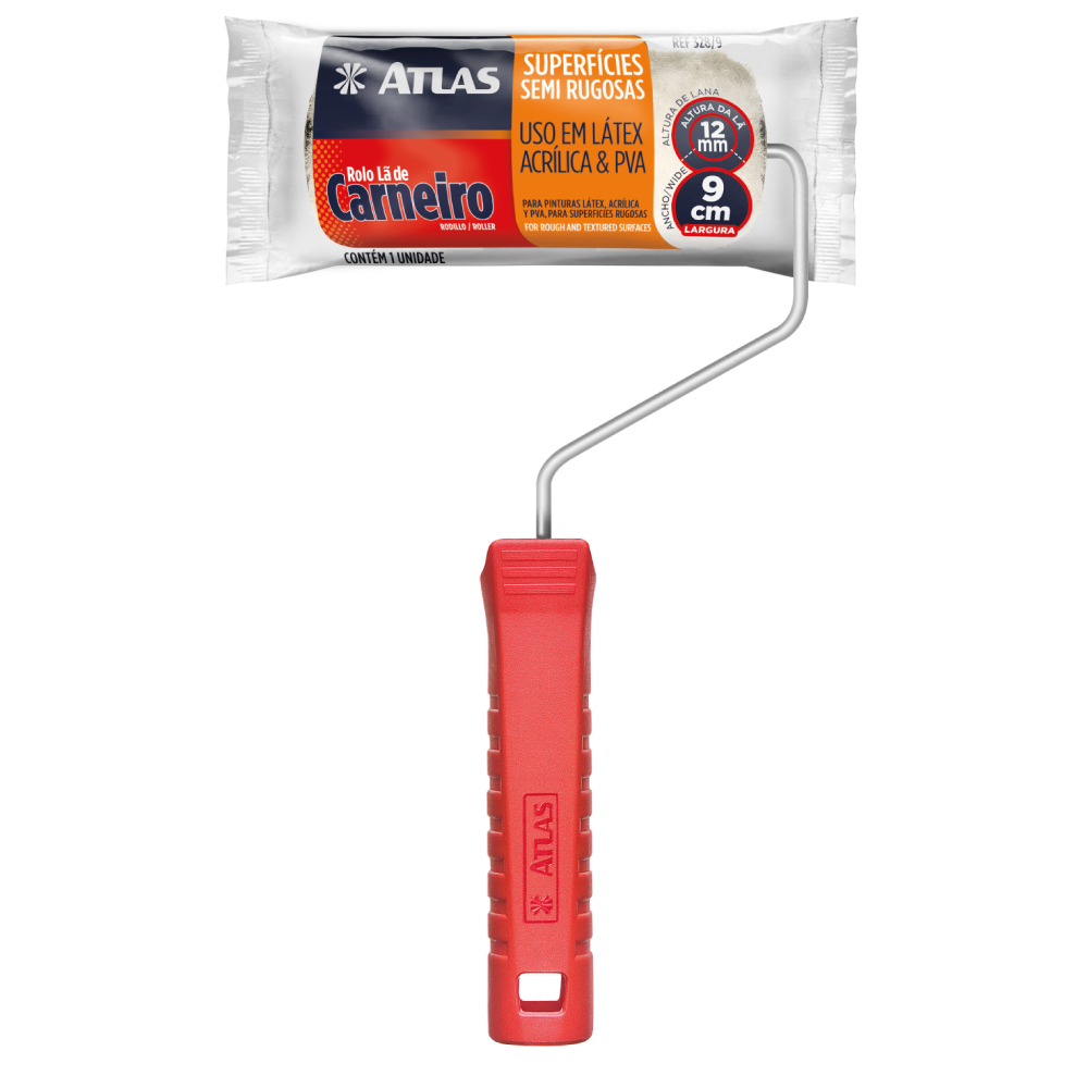 Rolo de 9cm com 100% lã natural tramada em tecido. Manta com 12mm de altura. Ideal para pinturas em superfícies lisas e semi-rugosas com tinta látex, acrílica, PVA, óleo e esmalte.